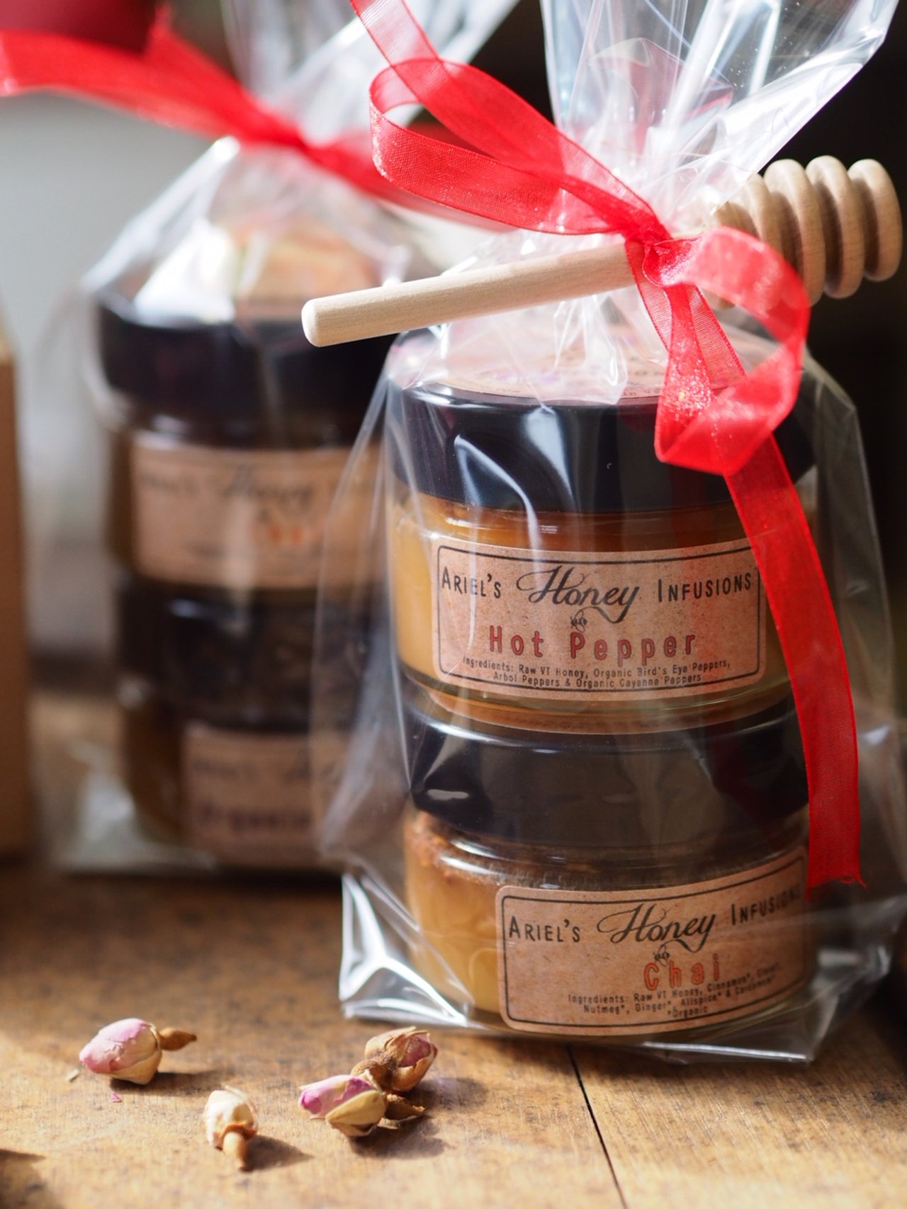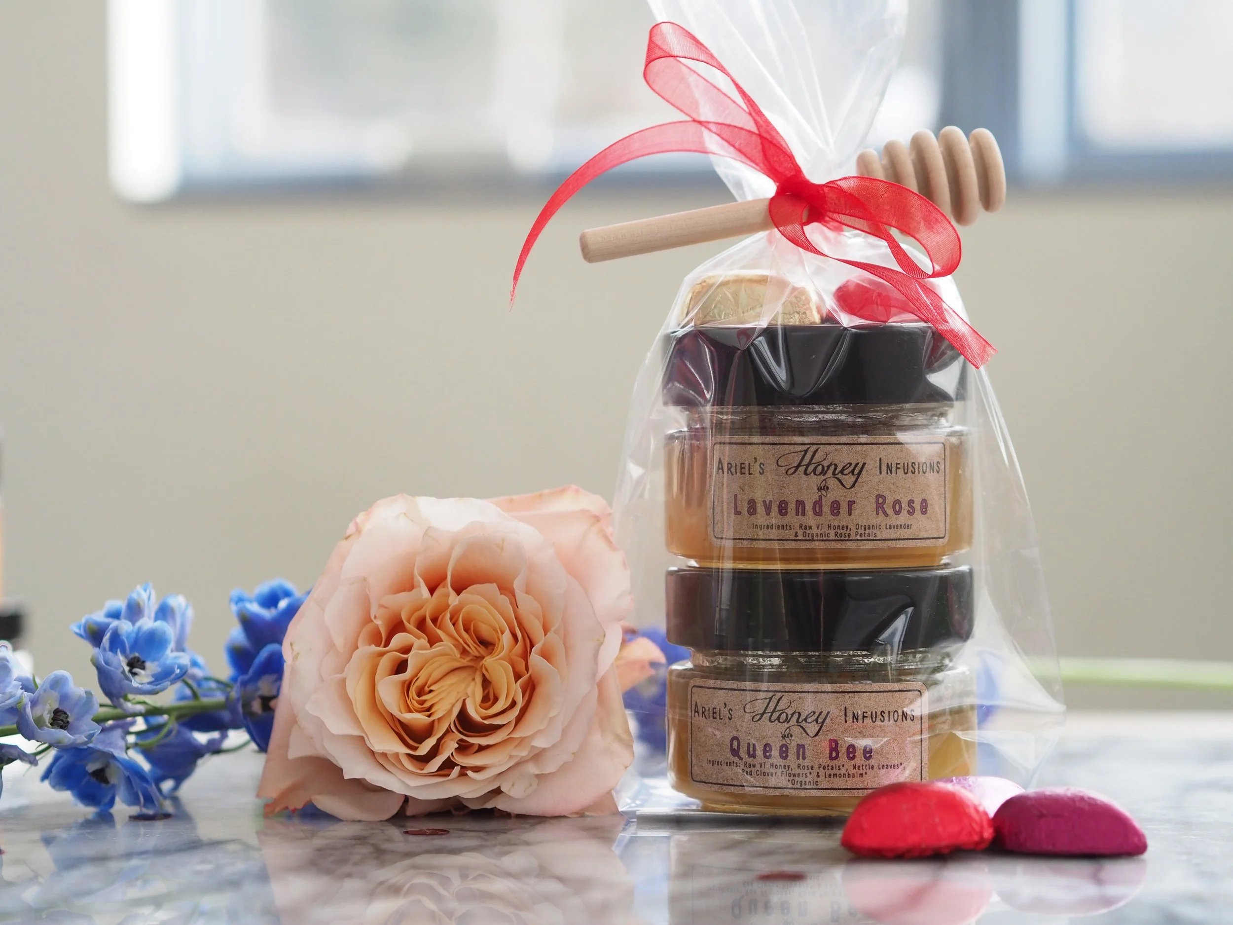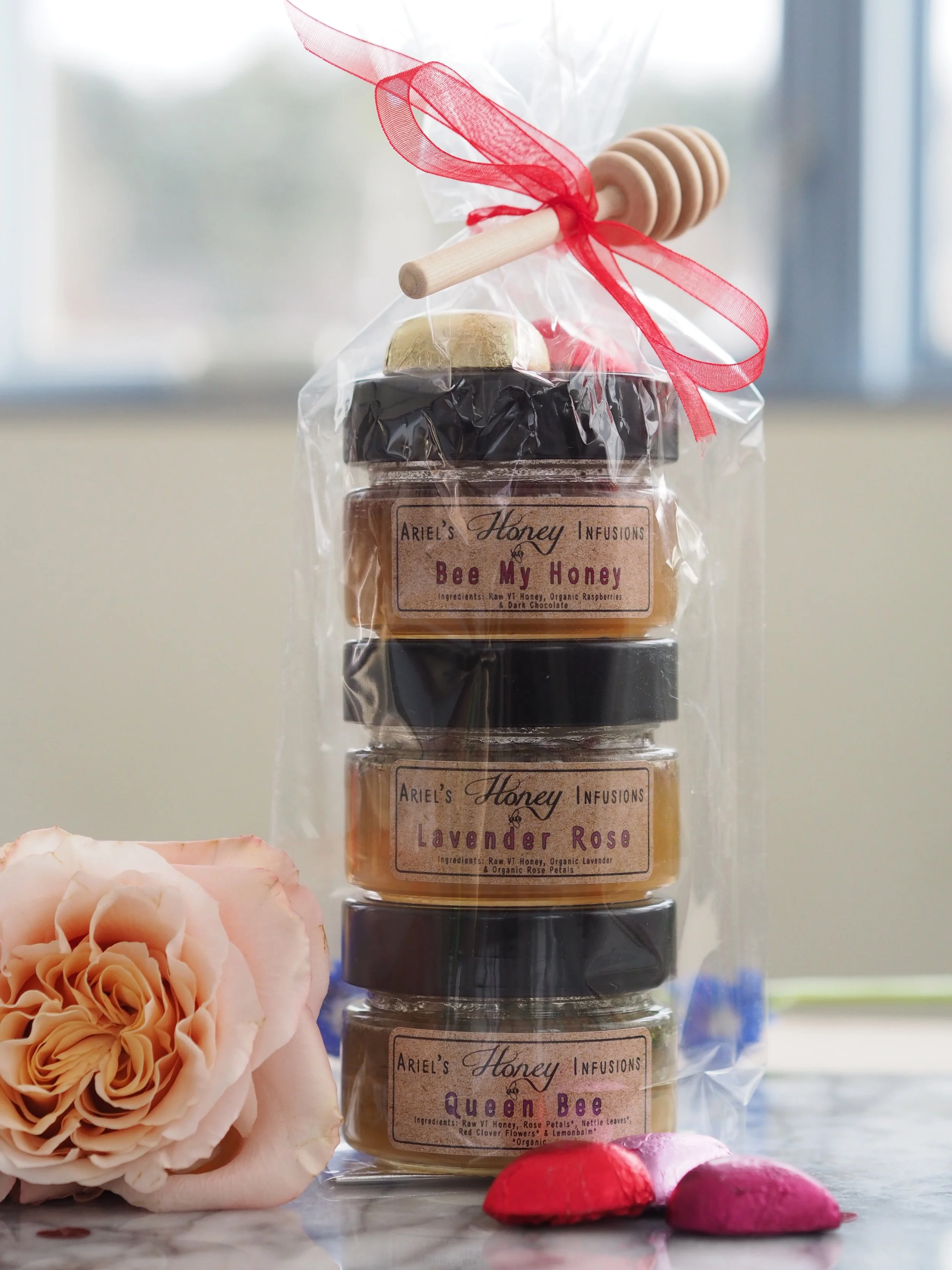 Each Flight comes Gift wrapped with your choice of either two or three 4.5 oz jars of Handcrafted Infused Honey. You choose infusions that pair perfectly for your Valentine’s Day Flights.